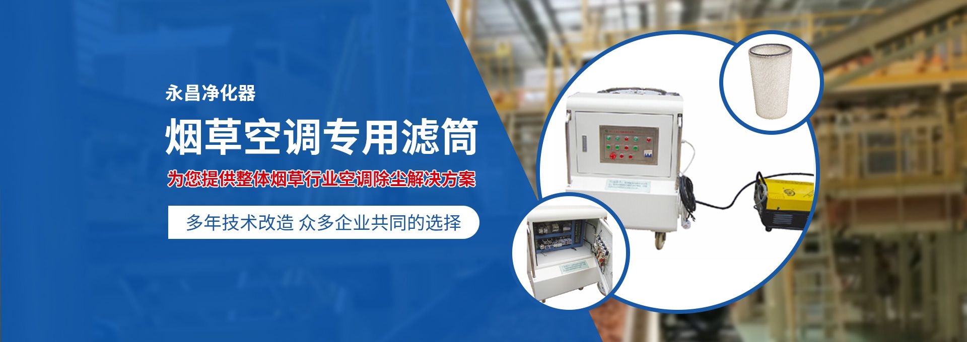 新鄉市永昌凈化器有限公司是生產煙草行業空調除塵專用濾筒的企業。注冊資金1000萬元。已通過ISO9001國際質量管理體系認證。對產品有嚴格的管理制度和售后服務。我公司以誠信、負責、守信譽、重質量的精神所生產的產品,近幾年來在煙草行業受到廣泛應用,并受到用戶的一致好評。  從一九九四年以來為煙廠的空調設備服務。十幾年來,我們不斷走出去請進來學習新技術。定期到用戶那里咨詢情況:互相交流,認真聽取寶貴意見,不斷提高產品質量。從經濟和安全,方便的角度出發(fā),根據煙廠濕度大的生產環(huán)境和濾筒收集到的含酸堿、氧化劑的粉塵。在空調箱工作狀態(tài)下我們頂著巨大的風壓危險在箱內停留了幾分鐘,認真查看濾筒工作情況,發(fā)現濾筒有并死狀態(tài),造成濾筒不過濾、不過風、壓差高的現象。經幾十次試驗分析,在標本兼治的原則下,有針對性的解決了這一問題。  我公司針對煙廠制絲、卷接包、混絲間、儲絲房、冷卻床、梗膨化等不同的生產環(huán)境,